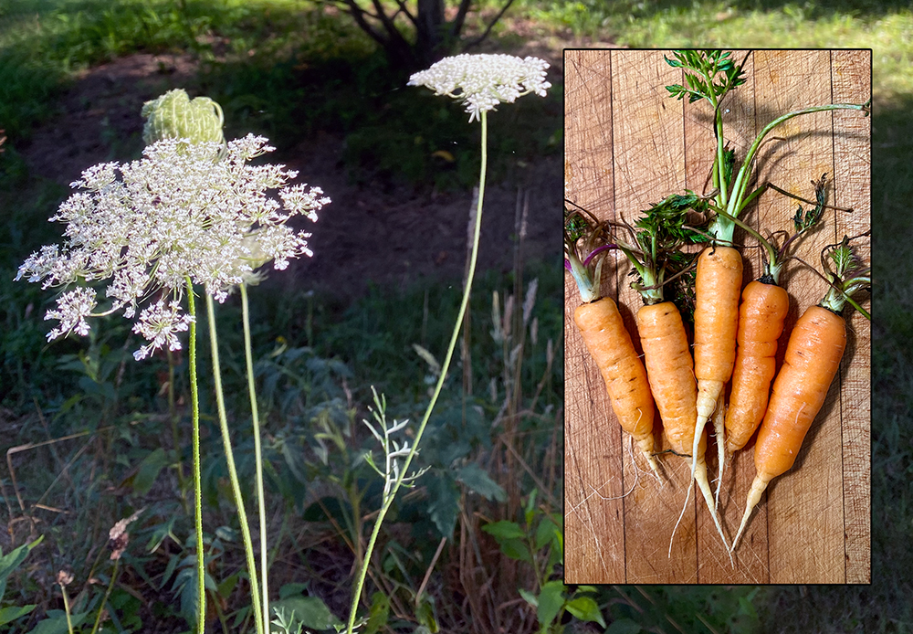 Our discussion is about how most plants are “weeds” somewhere, and how we have used them and they have used us. In fact, many common vegetables were bred from common weeds, and some common weeds were once food crops. Carrots originated from Queen Anne’s lace, Daucus carota. The wild version had a thin, tough, pale root. The orange carrots we know and love today were developed through selective breeding. And crabgrass, the weed we love to hate, was brought to North America as a grain crop. It was cultivated much like millet in Eastern Europe where it was ground into flower used in porridge. It was especially valued as a grain that would live in poor soils.