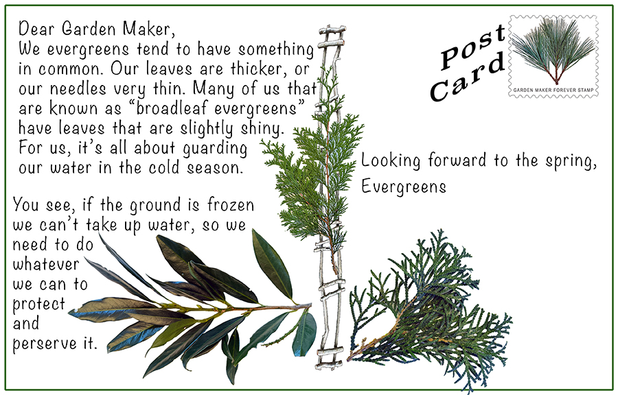 For evergreen plants, it’s all about water retention, protection from sun-scald, and fluctuating temperatures. Some plants have shiny foliage, while others have scale-like structures that protect the plant from water-loss.