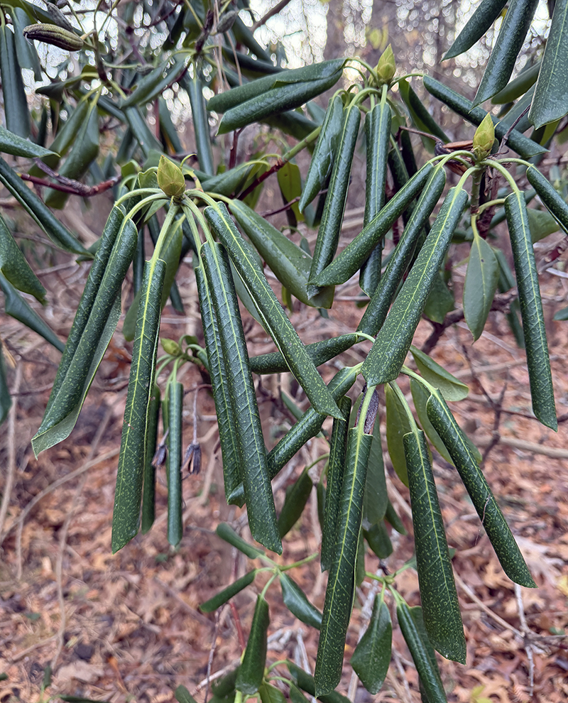 When it’s well below freezing, one look at a Rhododendron will remind you to put on your hat and gloves. This is called “thermoplasty,” refers to their remarkable ability to adjust growth, form, and function in response to temperature changes. This curling does several things for the plant: it conserves water, and makes less of the leaf exposed to both sun and cold. It also regulates temperatures a bit so that the foliage doesn’t warm up or freeze too quickly.