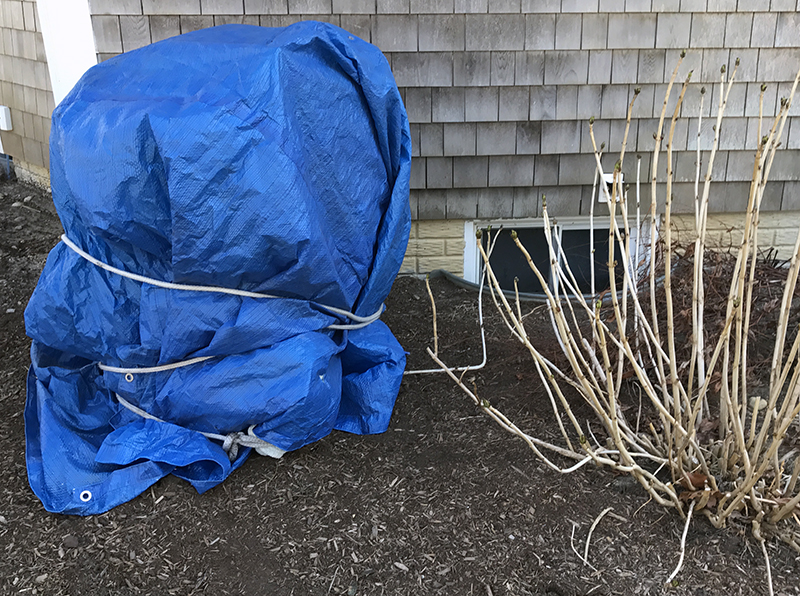 This hydrangea covered with a tarp is no better off in single digit weather than the uncovered plant next to it.
